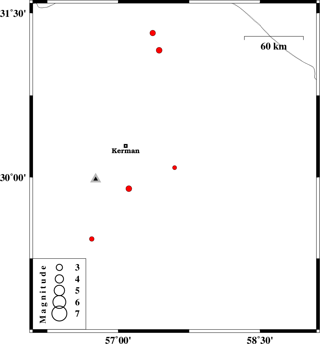| 2016/07/22 | 02:44:47.2 | 07:14:47.2 | 29.895 | 57.112 | 14 | ML:2.8 | Kerman Province, 44 km South of Kerman |
