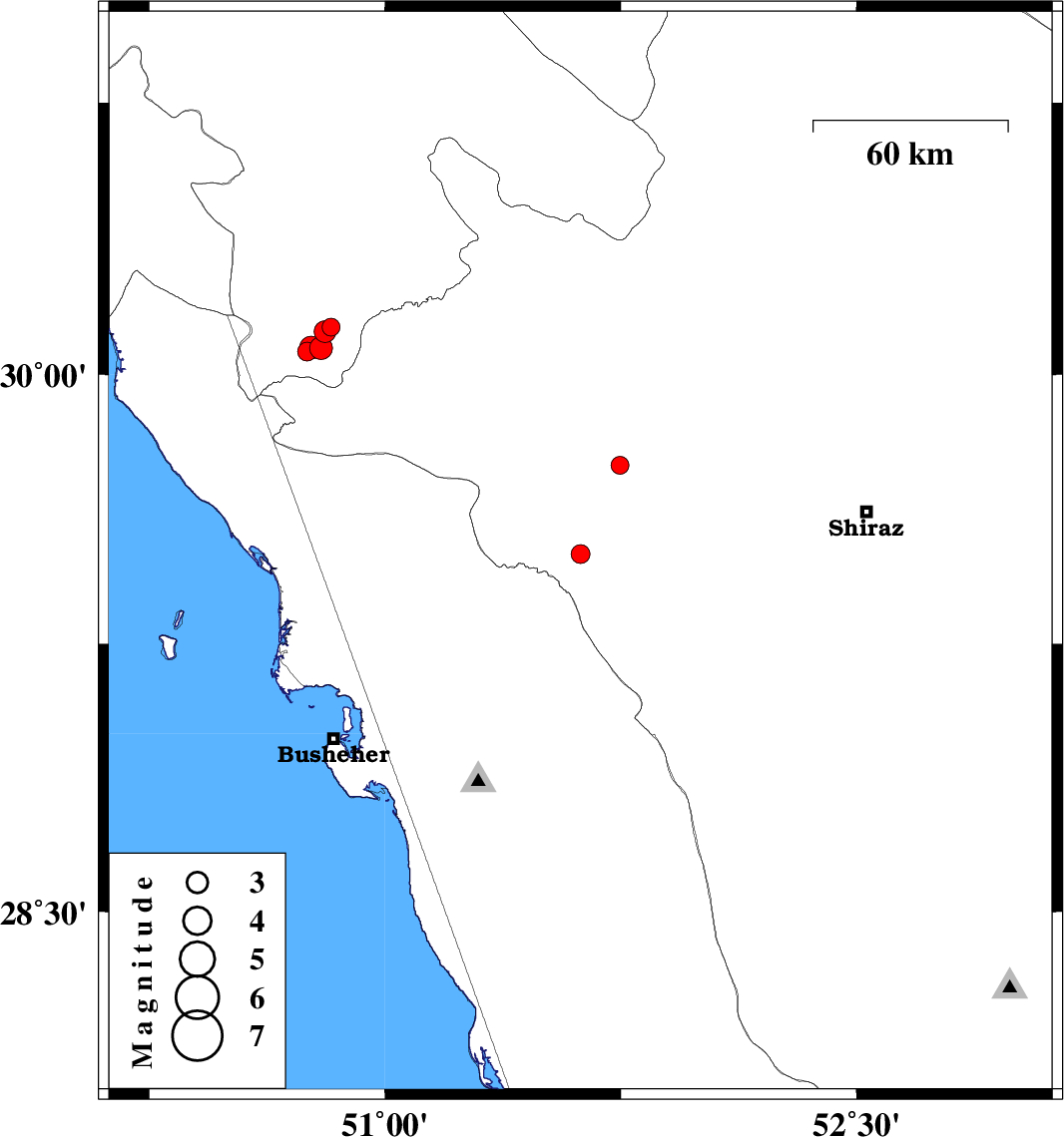 | 2016/08/15 | 00:58:00.3 | 05:28:00.3 | 29.501 | 51.622 | 6 | ML:2.7 | Fars Province, 14 km South of Kazerun | ||