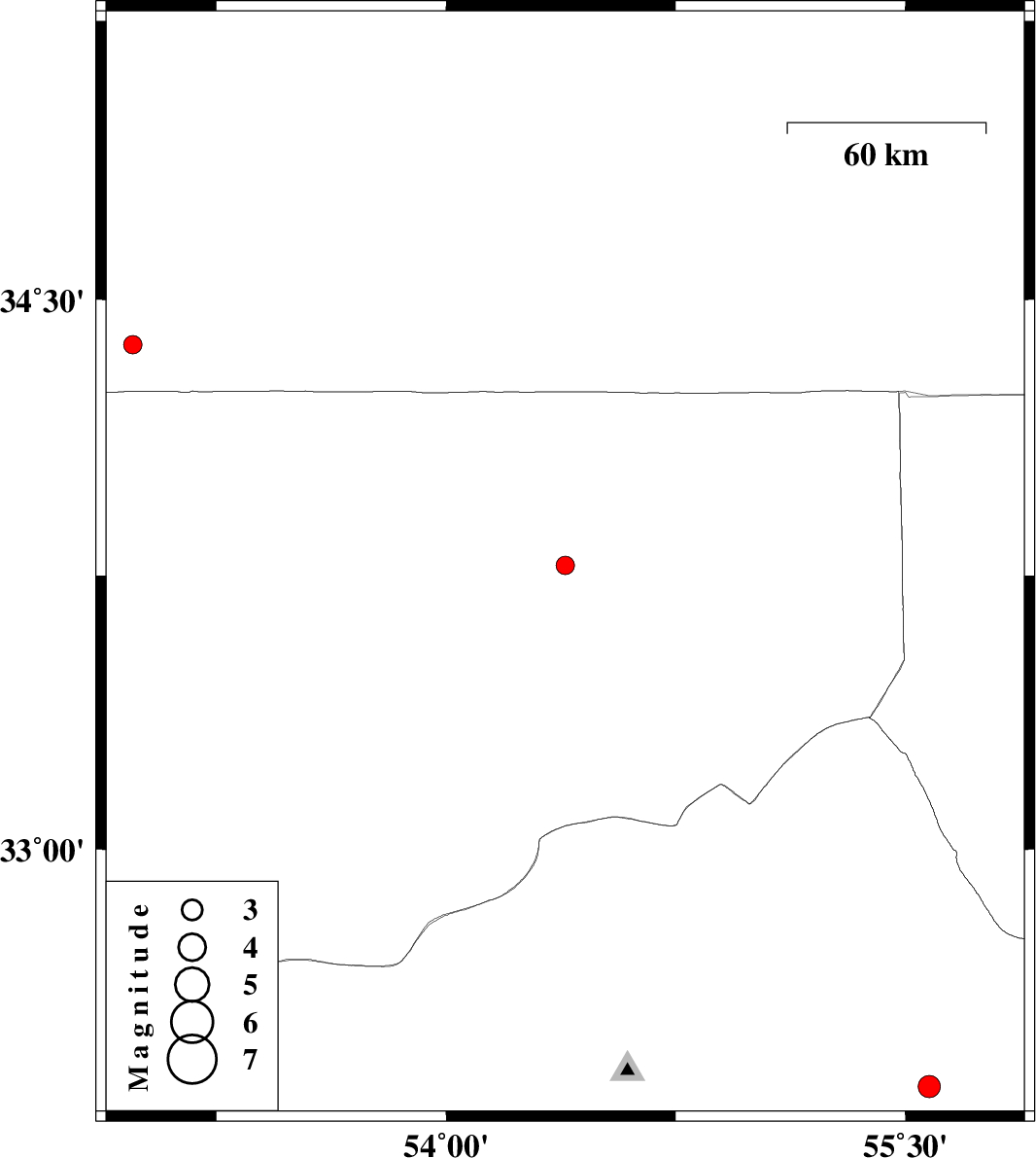 | 2016/08/24 | 01:11:07.3 | 05:41:07.3 | 34.378 | 52.976 | 15 | ML:2.7 | Semnan Province, 110 km South-East of Garmsar | ||