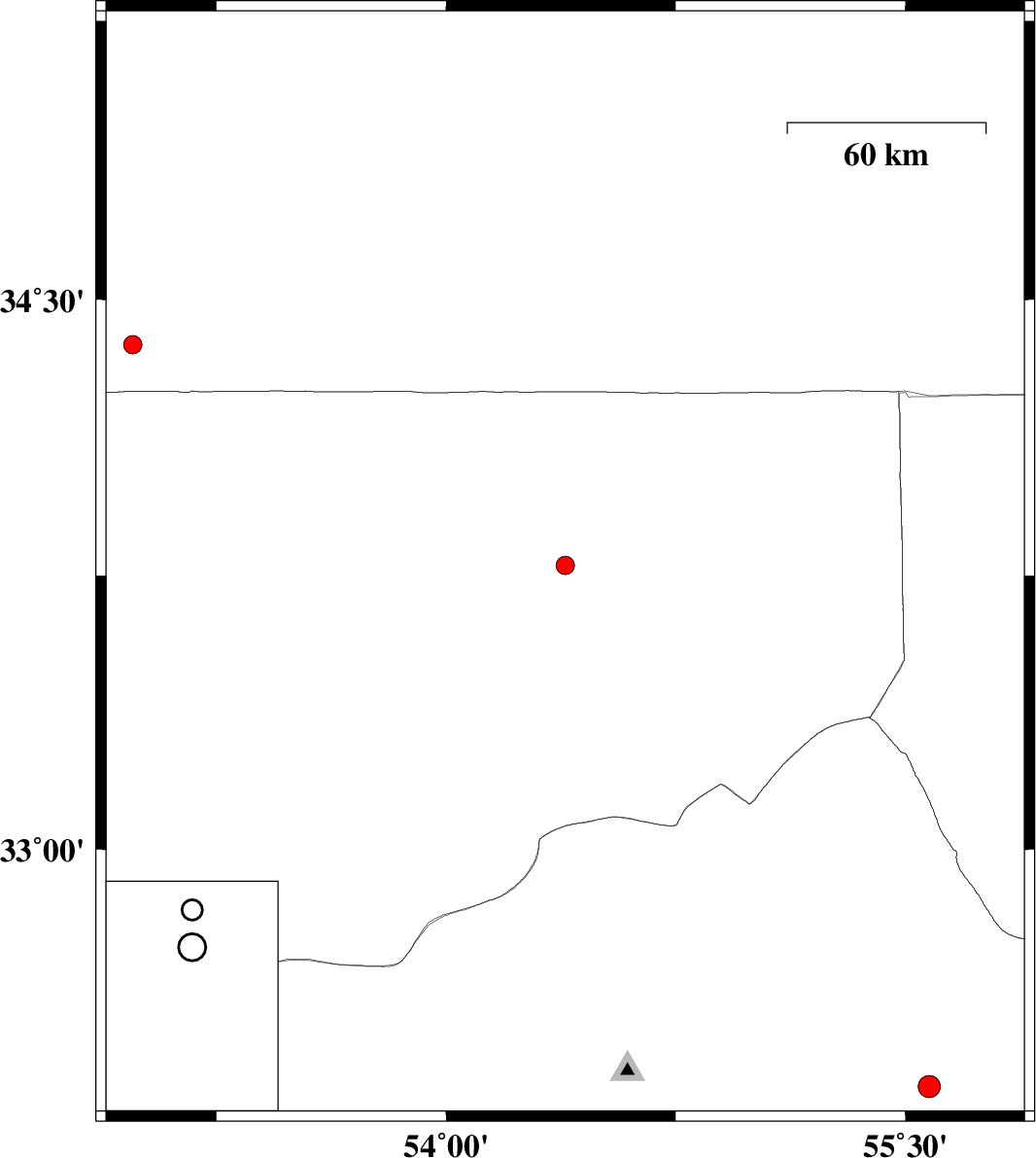| 2016/08/24 | 01:11:07.3 | 05:41:07.3 | 34.378 | 52.976 | 15 | ML:2.7 | Semnan Province, 110 km South-East of Garmsar | ||
