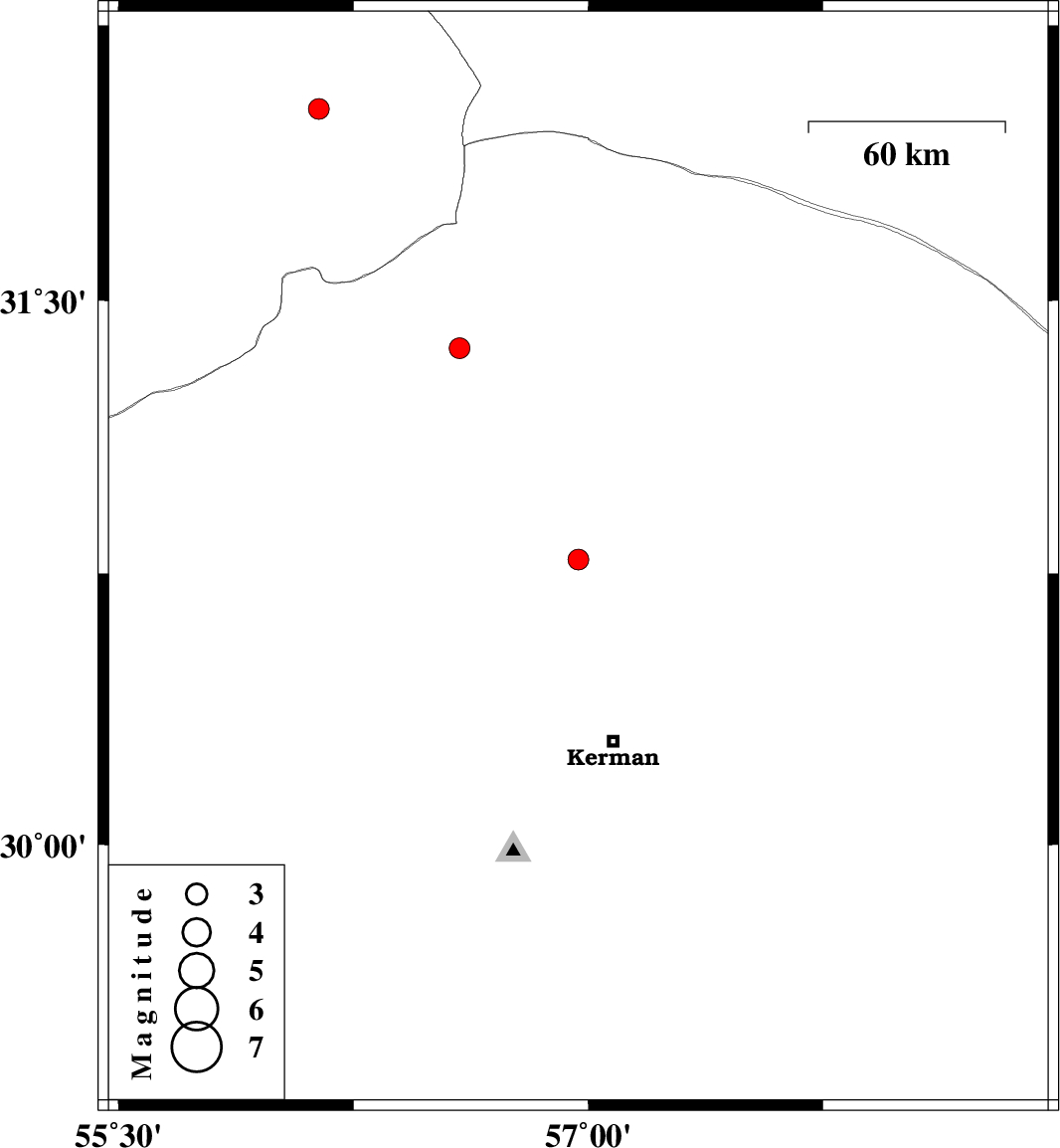 | 2016/08/28 | 04:23:09.9 | 08:53:09.9 | 31.369 | 56.589 | 30 | ML:3 | Kerman Province, 24 km North-West of Ravar | ||