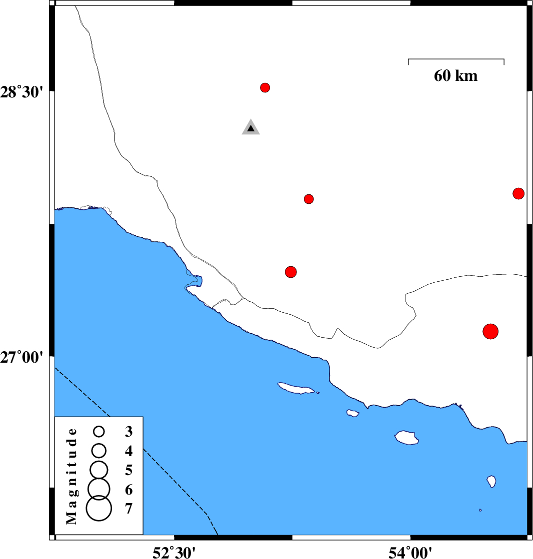 | 2016/08/25 | 05:23:07.3 | 09:53:07.3 | 27.922 | 54.686 | 15 | ML:3.3 | Fars Province, 44 km North-East of Lar | ||