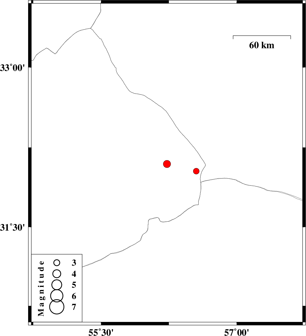 | 2016/09/10 | 18:03:42.1 | 22:33:42.1 | 32.095 | 56.229 | 14 | ML:3.6 | Yazd Province, 96 km North-East of Bafq | ||