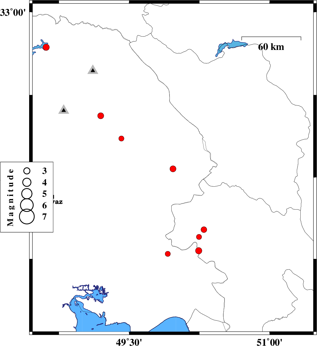 | 2016/08/20 | 21:35:28.3 | 02:05:28.3 | 32.682 | 48.614 | 15 | ML:3.1 | Khoozestan Province, 35 km North-East of Andimeshk |