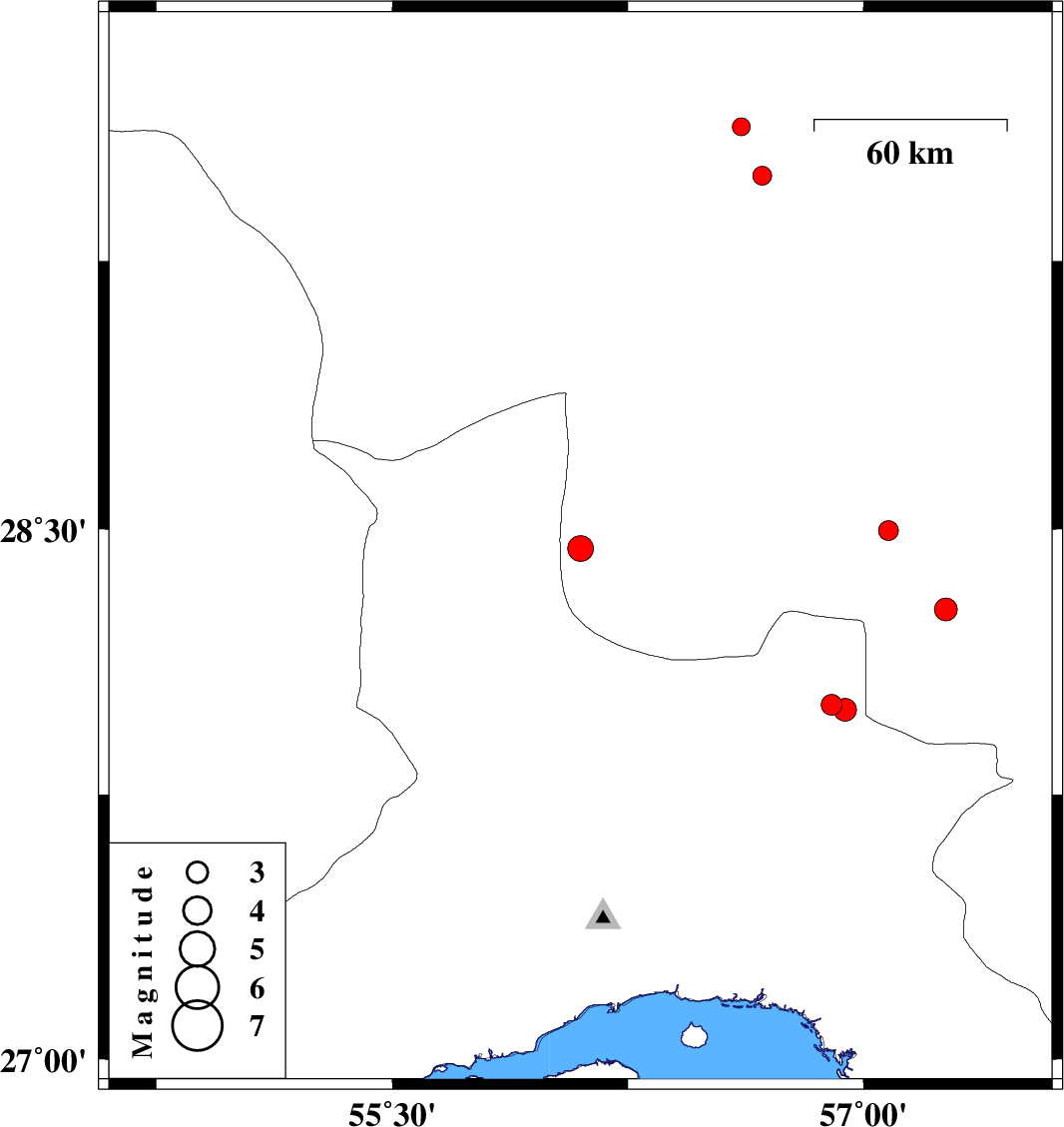 | 2016/09/25 | 20:37:59.7 | 00:07:59.7 | 28.444 | 56.099 | 15 | ML:3.6 | Kerman Province, 24 km North-East of Hajiabad | ||