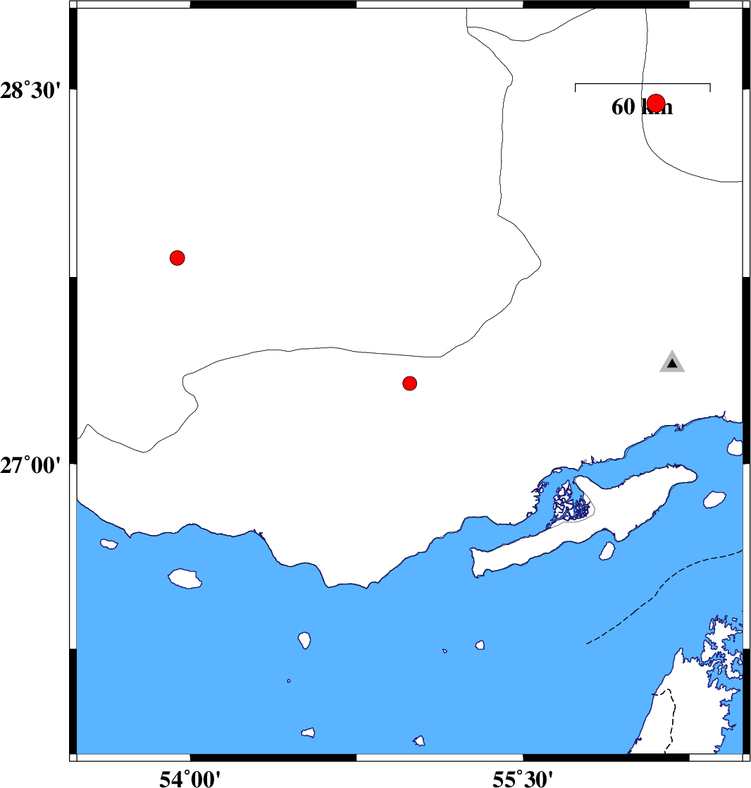 | 2016/09/26 | 18:05:08.9 | 21:35:08.9 | 27.323 | 54.989 | 15 | ML:2.8 | Hormozgan Province, 63 km North-East of Bastak | ||