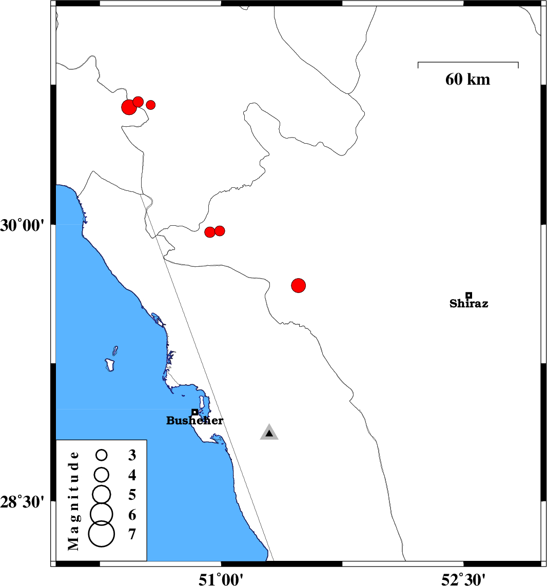 | 2016/09/21 | 15:25:10.8 | 18:55:10.8 | 29.966 | 50.991 | 6 | ML:2.8 | Fars Province, 47 km South-East of Dogonbadan | ||