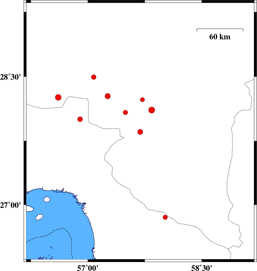 | 2016/10/02 | 02:39:35.8 | 06:09:35.8 | 27.856 | 57.69 | 16 | ML:3.1 | Kerman Province, 10 km of Kahnuj | ||