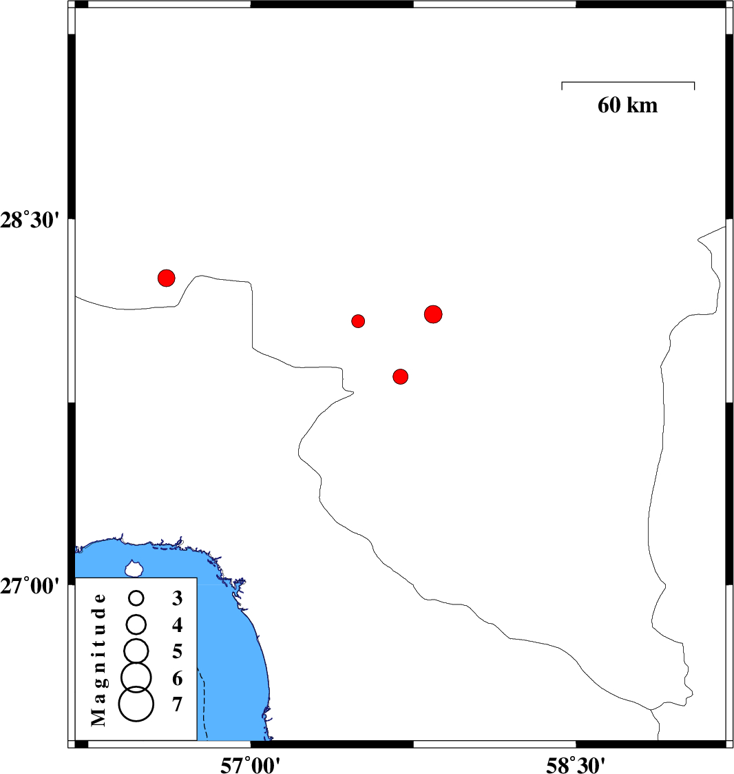 | 2016/10/02 | 02:39:35.8 | 06:09:35.8 | 27.856 | 57.69 | 16 | ML:3.1 | Kerman Province, 10 km of Kahnuj | ||