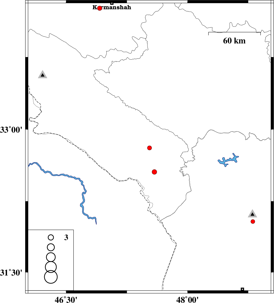 | 2016/10/05 | 01:06:39.5 | 04:36:39.5 | 34.253 | 46.914 | 6 | ML:2.5 | Kermanshah Province, 15 km -West of Kermanshah |