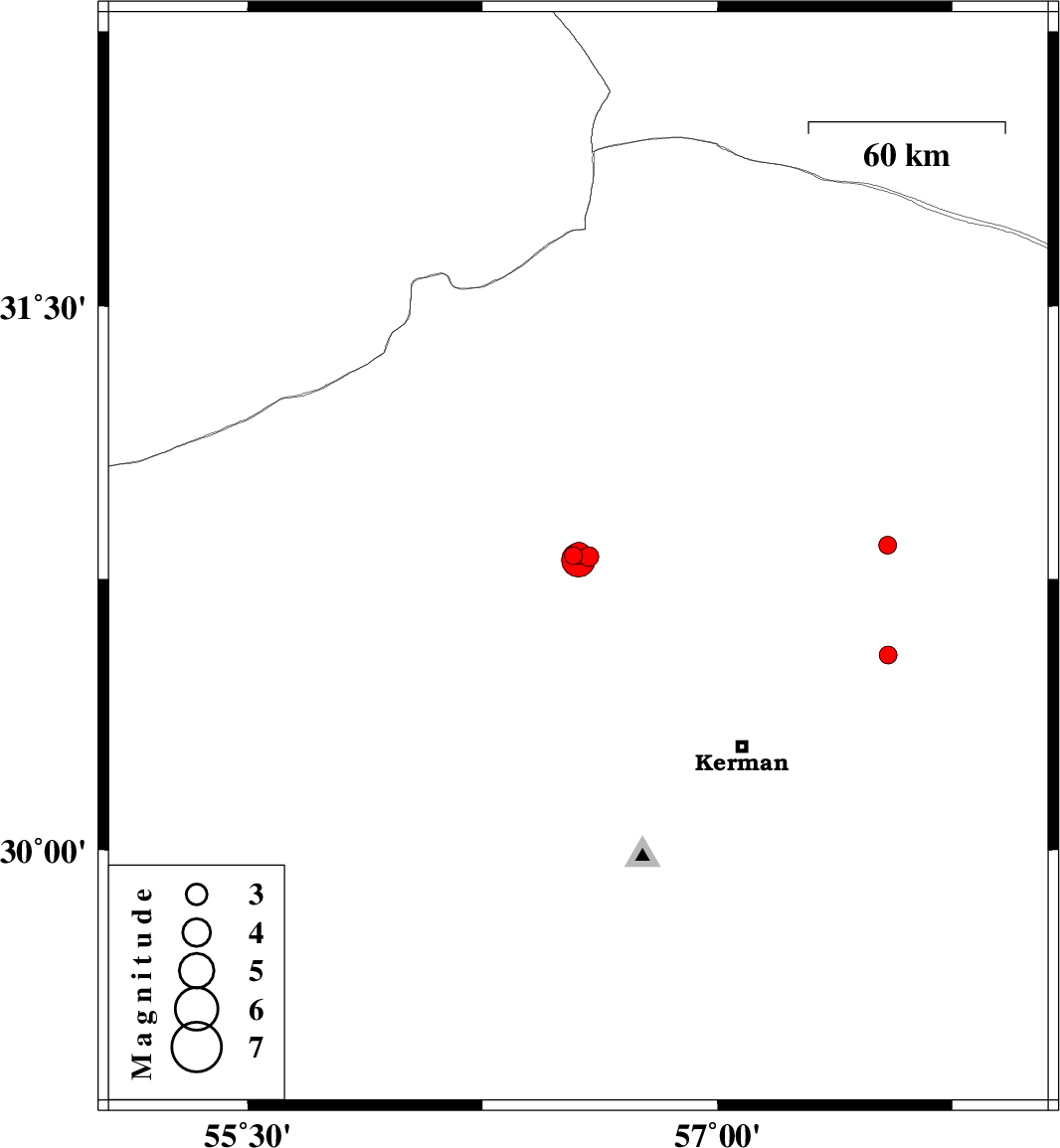 | 2016/10/20 | 15:22:36.3 | 18:52:36.3 | 30.822 | 56.558 | 6 | ML:3.1 | Kerman Province, 2 km of Zarand | ||