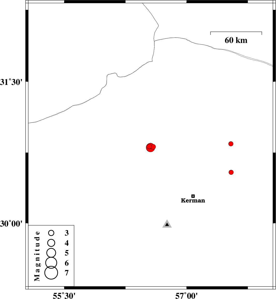 | 2016/10/20 | 15:22:36.3 | 18:52:36.3 | 30.822 | 56.558 | 6 | ML:3.1 | Kerman Province, 2 km of Zarand | ||