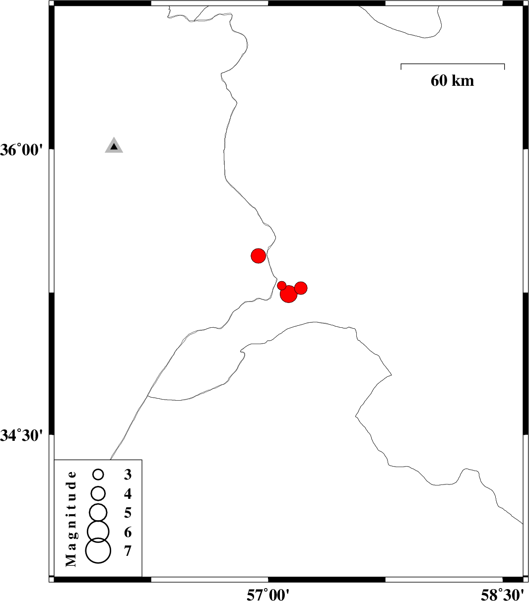 | 2016/10/25 | 04:27:15.7 | 07:57:15.7 | 35.242 | 57.13 | 17 | ML:4.9 | Khorasan(center) Province, 75 km -West of Bardeskan |