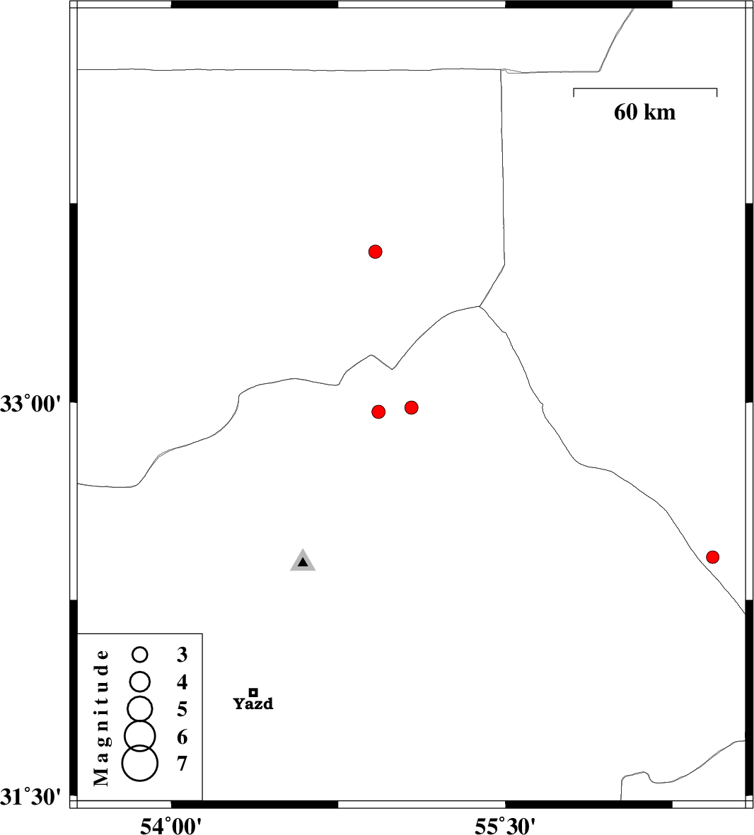 | 2016/10/31 | 09:06:33.6 | 12:36:33.6 | 32.98 | 55.078 | 11 | ML:2.7 | Yazd Province, 156 km North-West of Bafq | ||