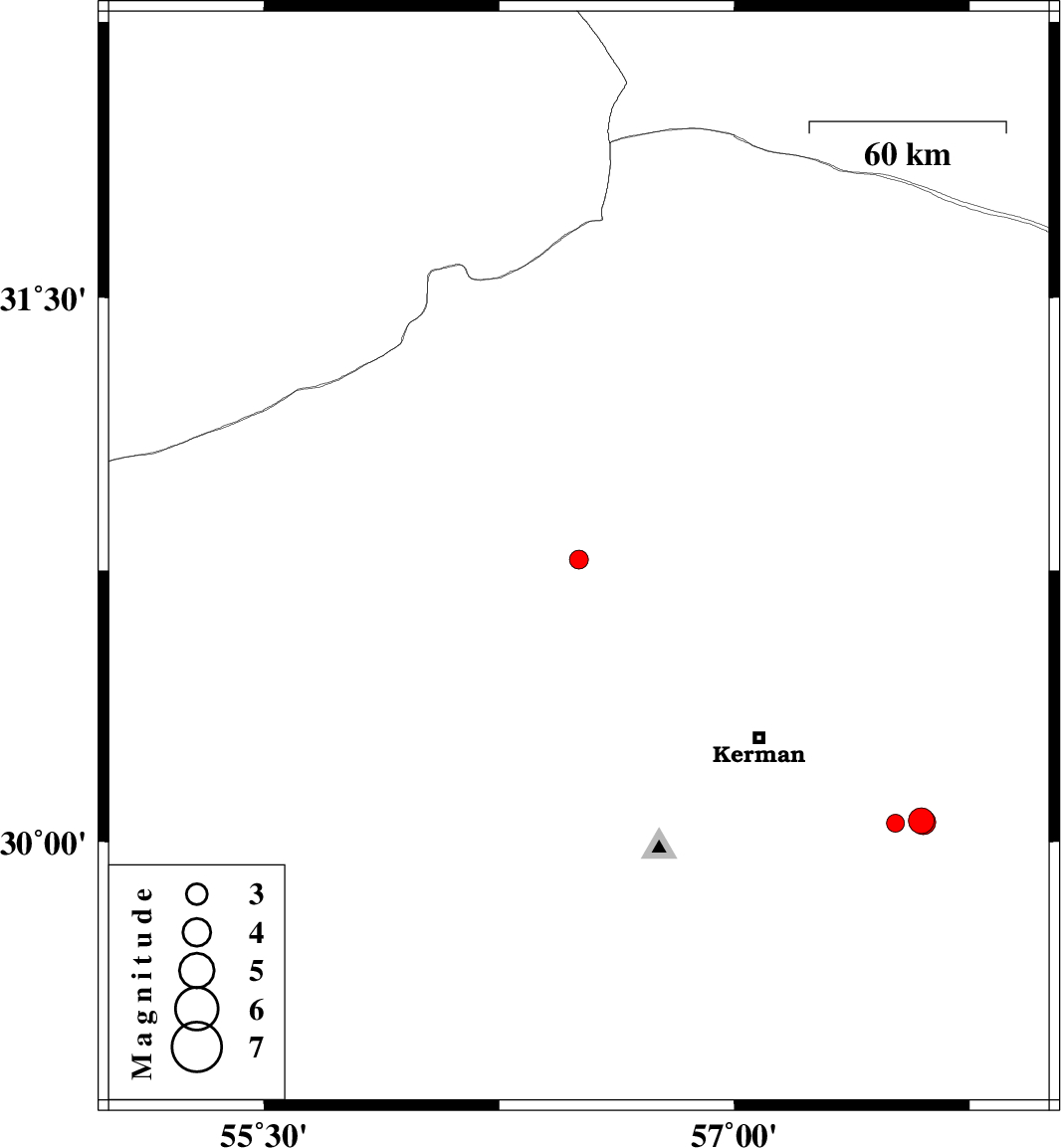 | 2016/11/10 | 06:48:10.4 | 10:18:10.4 | 30.053 | 57.602 | 7 | ML:3.5 | Kerman Province, 57 km South-East of Kerman |