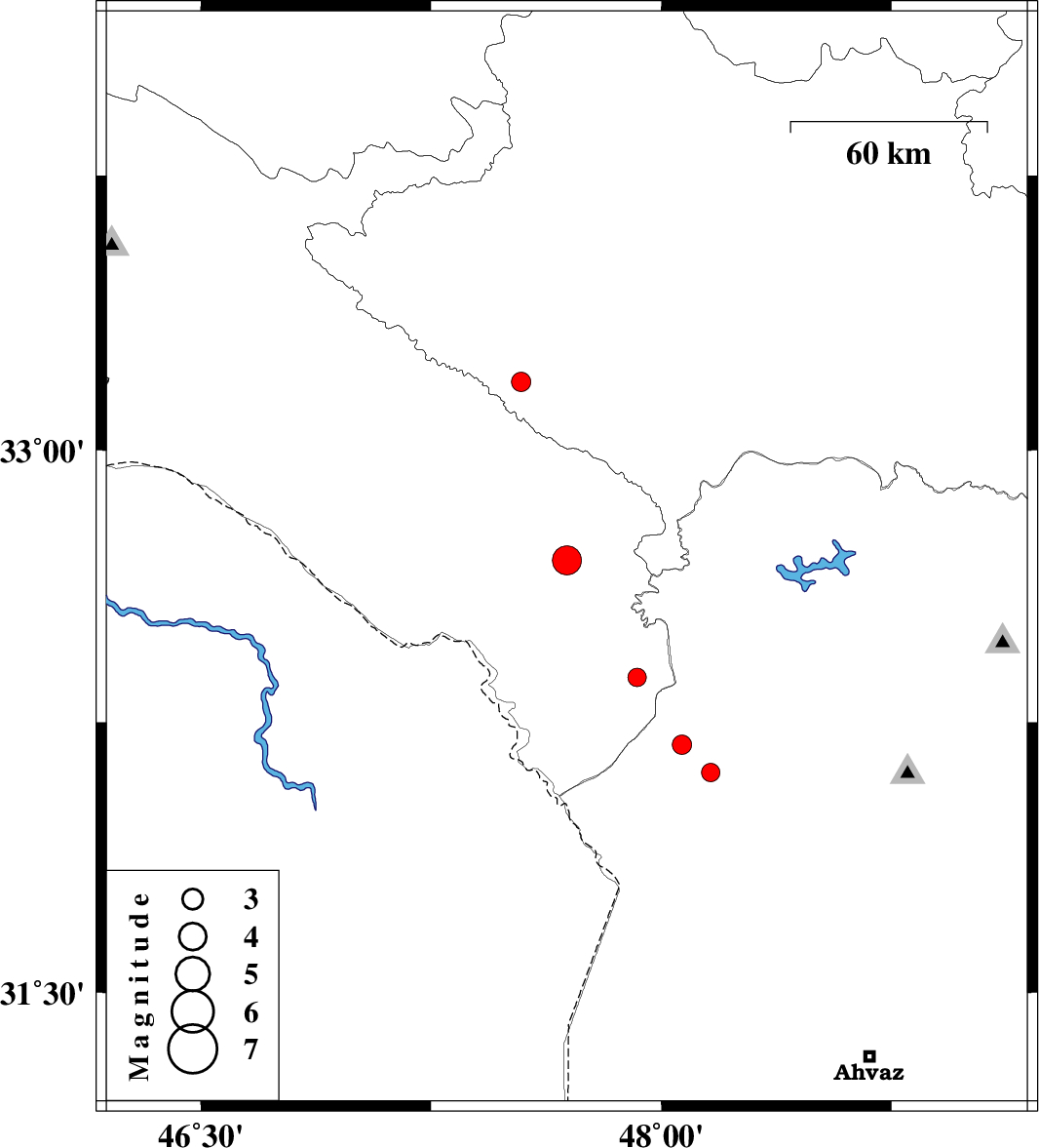| 2016/11/14 | 23:33:03.5 | 03:03:03.5 | 32.188 | 48.067 | 14 | ML:2.8 | Khoozestan Province, 17 km -West of Shush | ||
