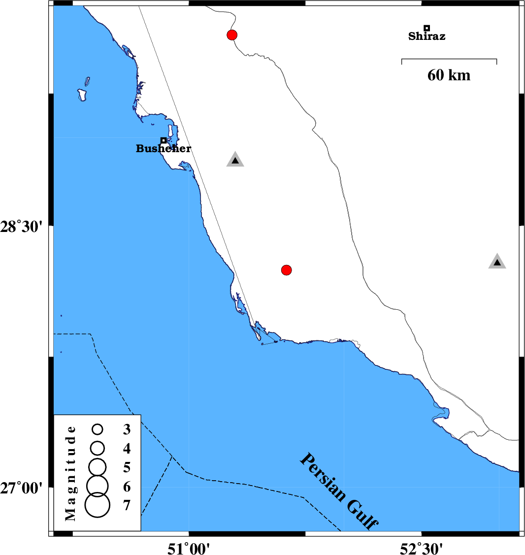 | 2016/11/17 | 21:27:49.3 | 00:57:49.3 | 29.581 | 51.278 | 6 | ML:2.9 | Bushehr Province, 36 km North of Borazjan |