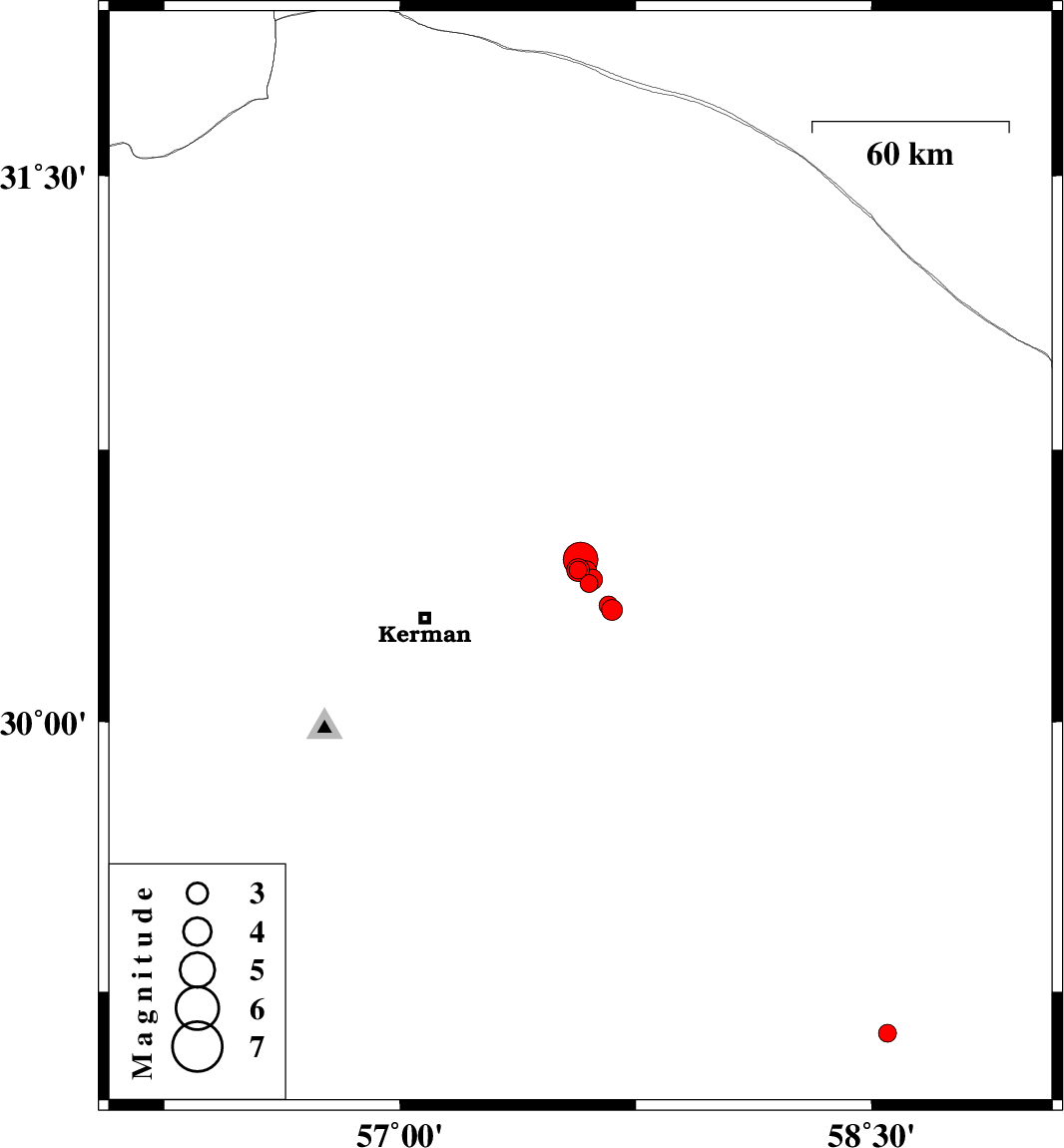 | 2016/12/01 | 10:43:59.3 | 14:13:59.3 | 30.419 | 57.566 | 14 | ML:3.2 | Kerman Province, 49 km North-East of Kerman | ||