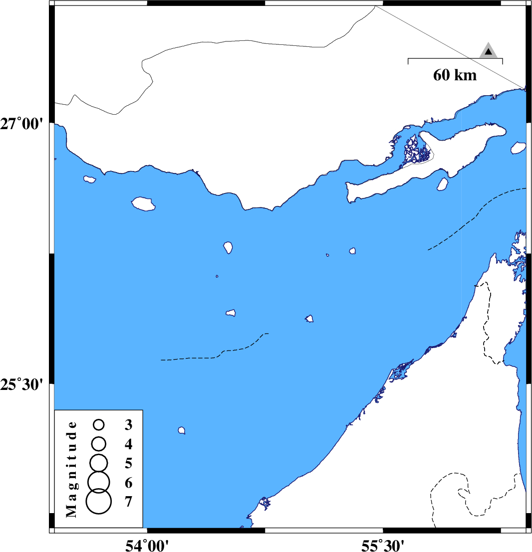 | 2016/12/09 | 16:06:07.5 | 19:36:07.5 | 26.165 | 54.91 | 15 | ML:3.4 | Persian Gulf, 35 km North-West of Abu Musa |