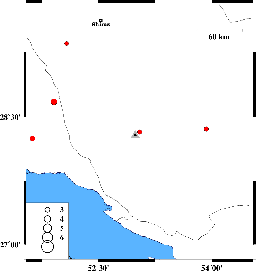 | 2016/12/10 | 20:29:47.2 | 23:59:47.2 | 28.322 | 53.045 | 14 | ML:2.7 | Fars Province, 16 km South of Qir va Karzin | ||