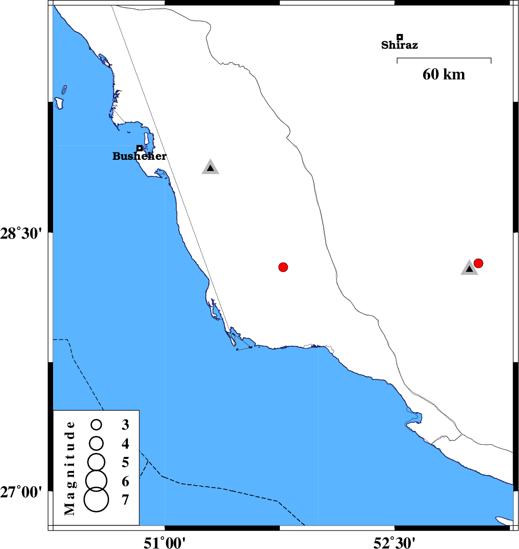 | 2016/12/13 | 18:44:11.1 | 22:14:11.1 | 28.3 | 51.772 | 22 | ML:2.7 | Bushehr Province, 55 km South-East of Khormog | ||