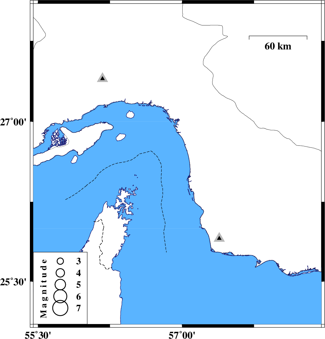 | 2016/12/27 | 02:44:51.1 | 06:14:51.1 | 26.596 | 56.951 | 18 | ML:3 | Oman Sea, 63 km South-West of Minab |