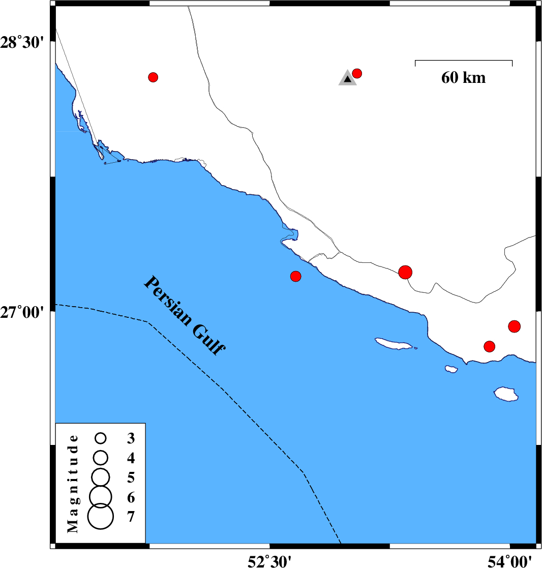| 2017/01/03 | 18:34:31.0 | 22:04:31.0 | 27.194 | 52.662 | 14 | ML:3 | Persian Gulf, 45 km South-West of Mehr | ||