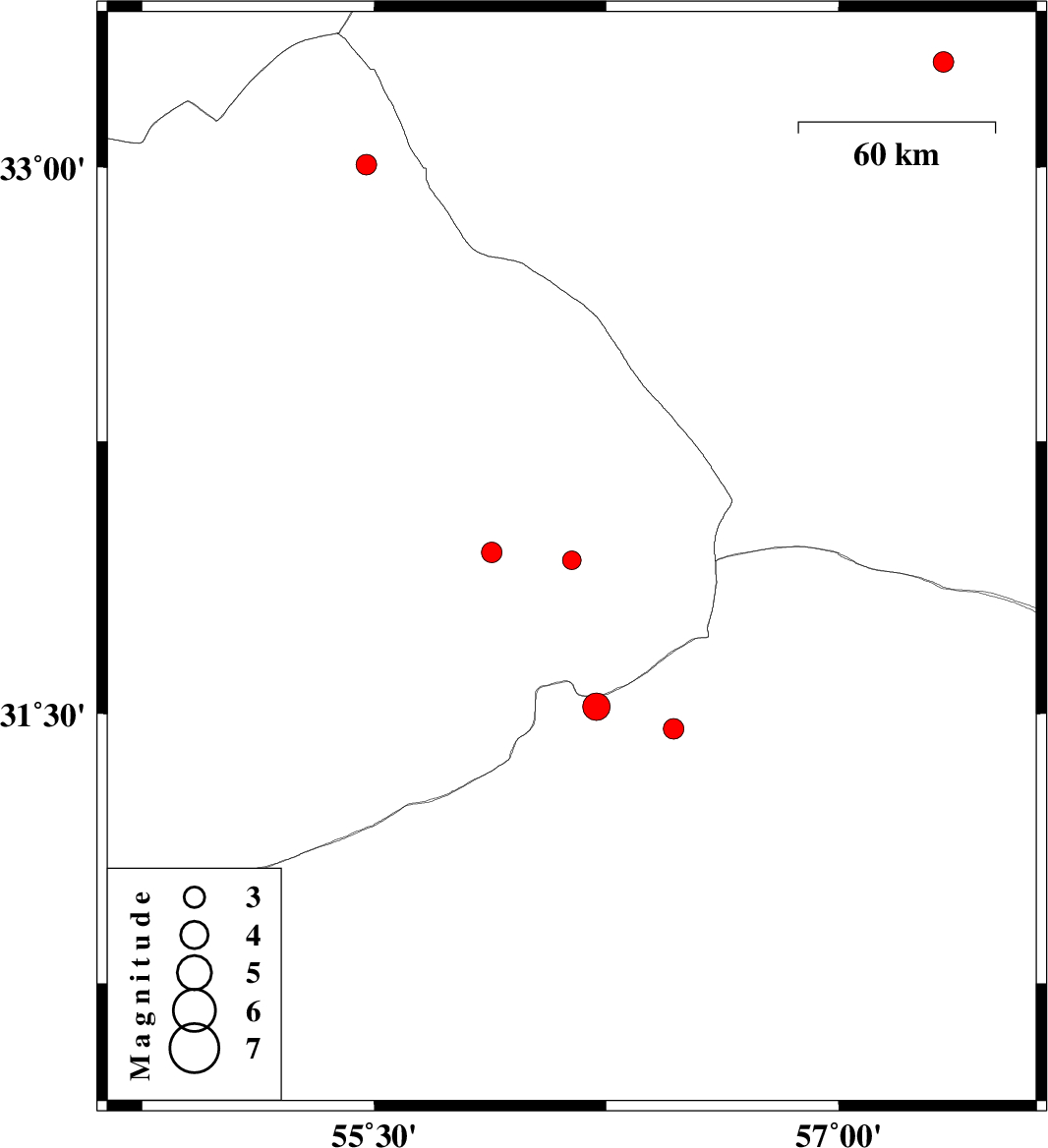 | 2017/01/08 | 13:14:10.8 | 16:44:10.8 | 33.007 | 55.475 | 14 | ML:3 | Yazd Province, 156 km North of Bafq | ||