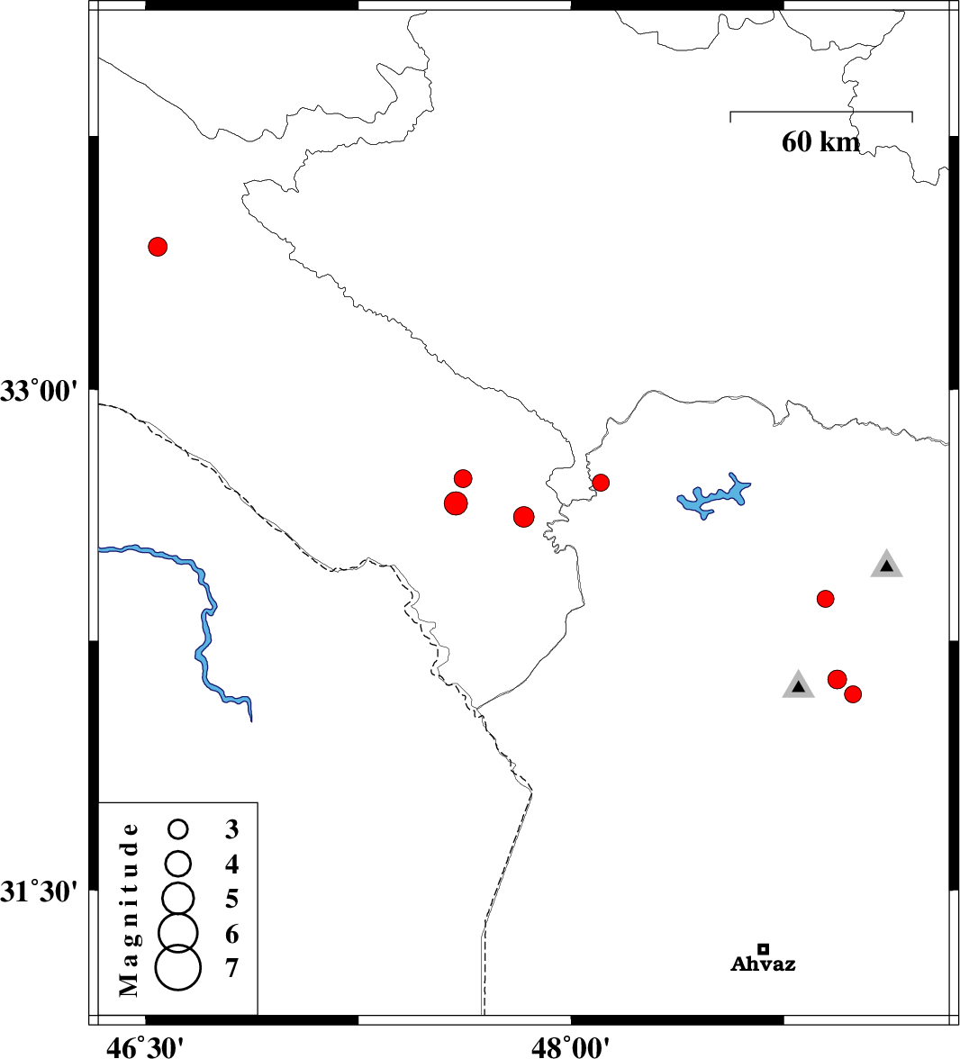 | 2017/01/05 | 23:03:59.2 | 02:33:59.2 | 32.735 | 47.619 | 14 | ML:2.8 | Ilam Province, 26 km South-East of Abdanan | ||