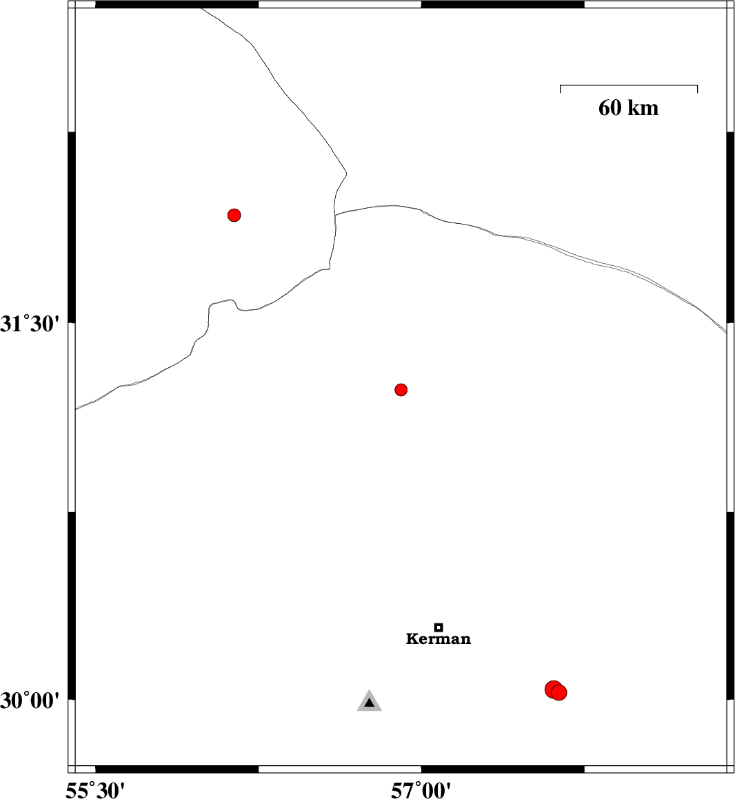 | 2017/01/26 | 06:36:02.5 | 10:06:02.5 | 30.027 | 57.634 | 14 | ML:3.3 | Kerman Province, 61 km South-East of Kerman | ||