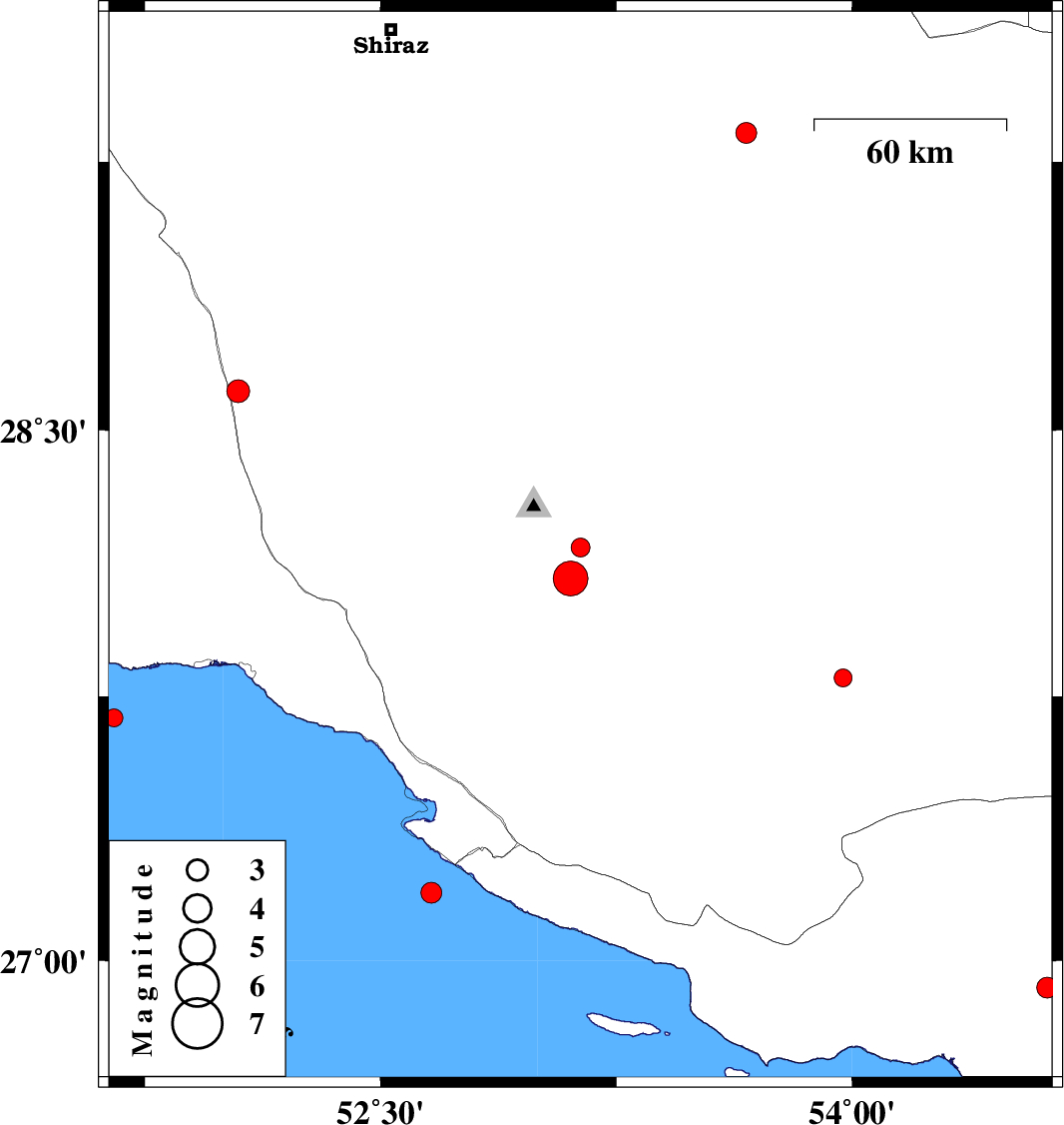 | 2017/01/06 | 02:33:27.7 | 06:03:27.7 | 28.083 | 53.104 | 15 | ML:4.9 | Fars Province, 43 km South of Qir va Karzin | ||