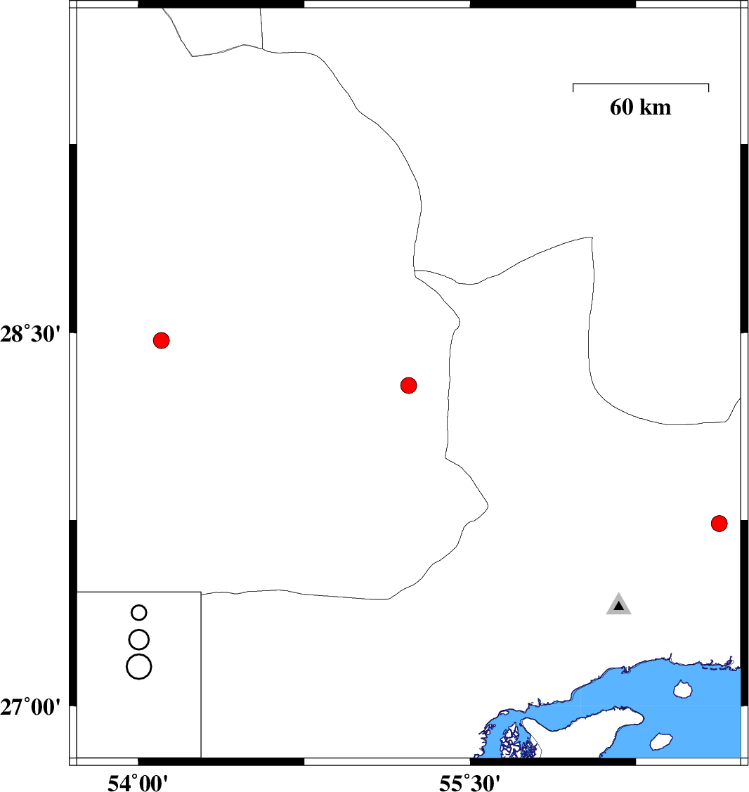 | 2017/02/09 | 13:15:25.9 | 16:45:25.9 | 28.289 | 55.222 | 15 | ML:3.3 | Fars Province, 67 km -West of Hajiabad | ||