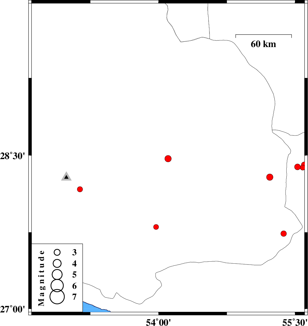 | 2017/02/02 | 21:58:08.3 | 01:28:08.3 | 28.17 | 53.136 | 6 | ML:2.7 | Fars Province, 34 km South-East of Qir va Karzin | ||