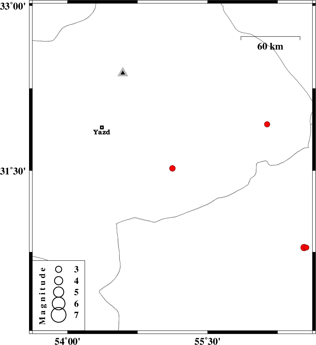 | 2017/01/27 | 11:13:37.6 | 14:43:37.6 | 31.923 | 56.138 | 14 | ML:2.7 | Yazd Province, 78 km North-East of Bafq |