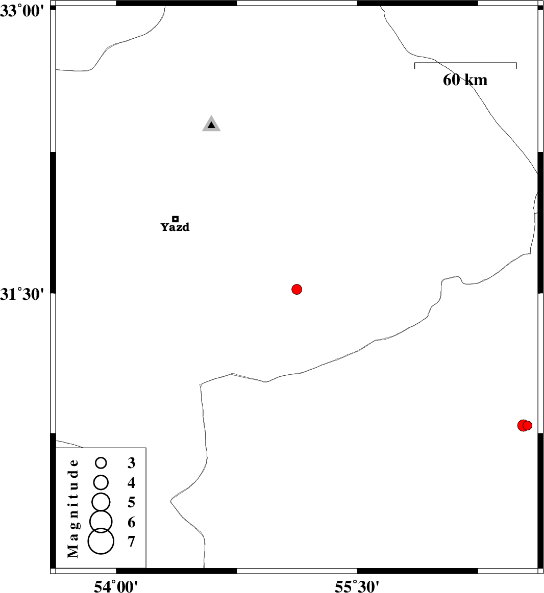 | 2017/02/21 | 08:17:17.8 | 11:47:17.8 | 31.521 | 55.123 | 14 | ML:2.8 | Yazd Province, 28 km -West of Bafq | ||