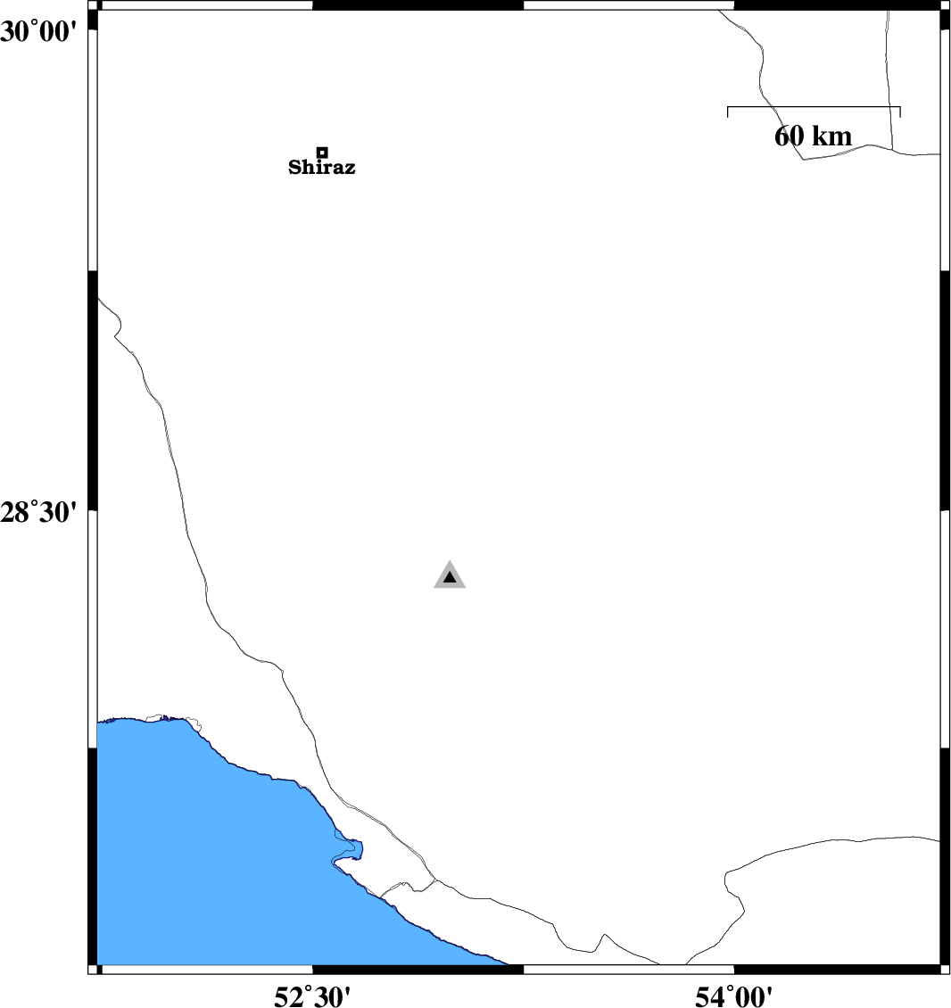 | 2017/02/21 | 10:02:00.5 | 13:32:00.5 | 28.078 | 53.029 | 14 | ML:2.6 | Fars Province, 43 km South of Qir va Karzin |
