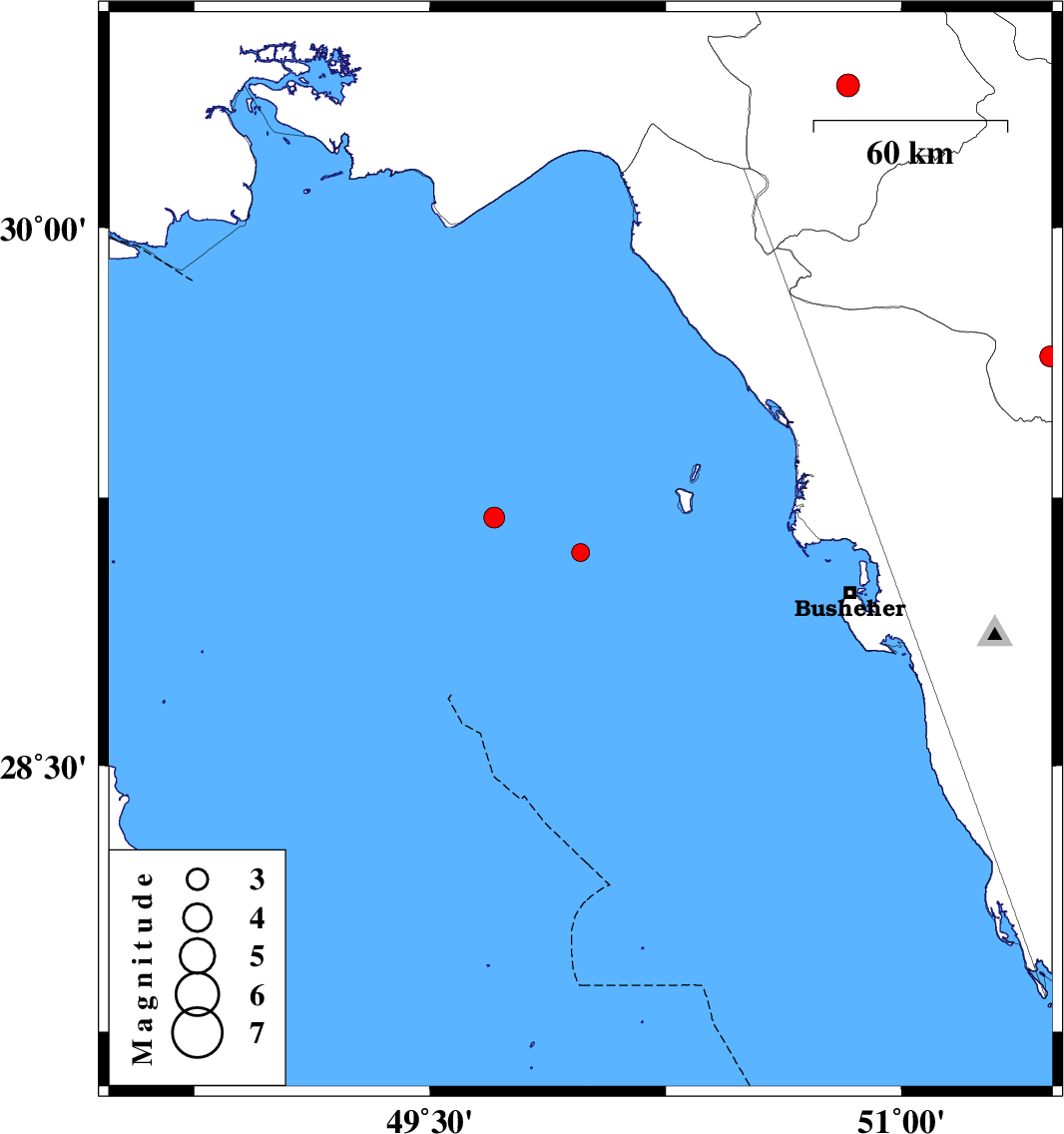 | 2017/02/27 | 22:01:22.7 | 01:31:22.7 | 29.097 | 49.979 | 16 | ML:2.6 | Persian Gulf, 84 km North-West of Busheher | ||