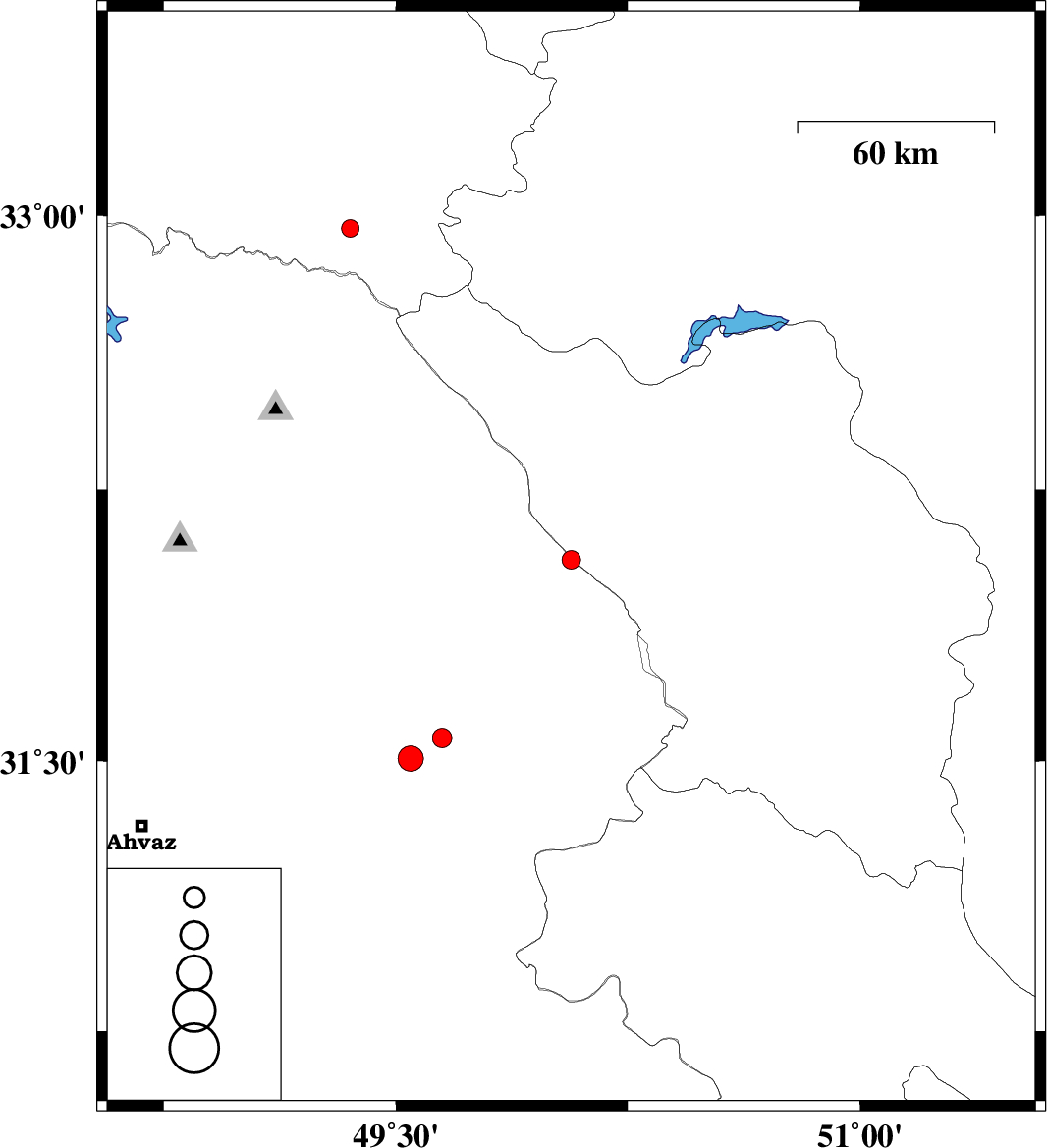 | 2017/01/31 | 10:14:53.2 | 13:44:53.2 | 32.964 | 49.353 | 15 | ML:2.5 | Lorestan Province, 55 km South-West of Azna |