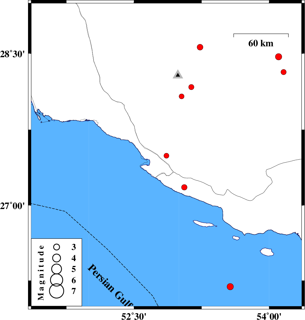 | 2017/02/21 | 10:02:00.5 | 13:32:00.5 | 28.078 | 53.029 | 14 | ML:2.6 | Fars Province, 43 km South of Qir va Karzin | ||