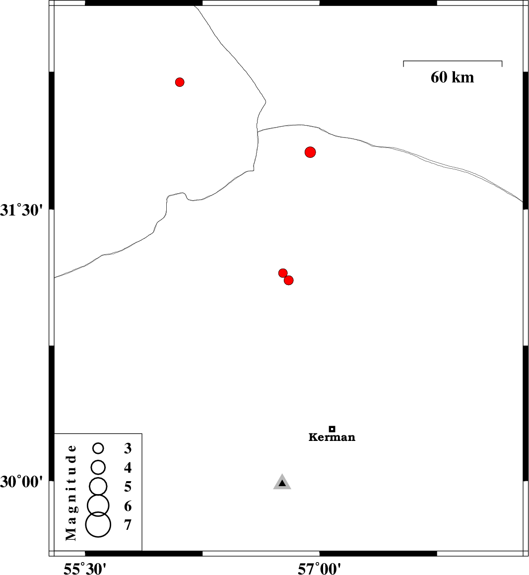 | 2017/02/27 | 11:12:43.1 | 14:42:43.1 | 31.811 | 56.94 | 14 | ML:3.1 | Kerman Province, 62 km North-East of Ravar |