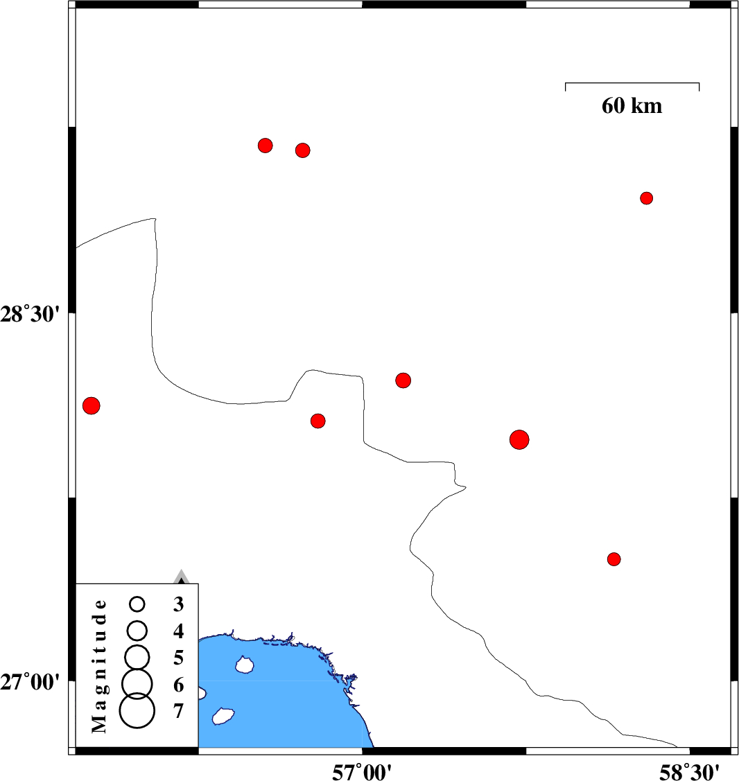 | 2017/02/22 | 01:57:18.2 | 05:27:18.2 | 27.986 | 57.719 | 28 | ML:4 | Kerman Province, 5 km of Kahnuj | ||