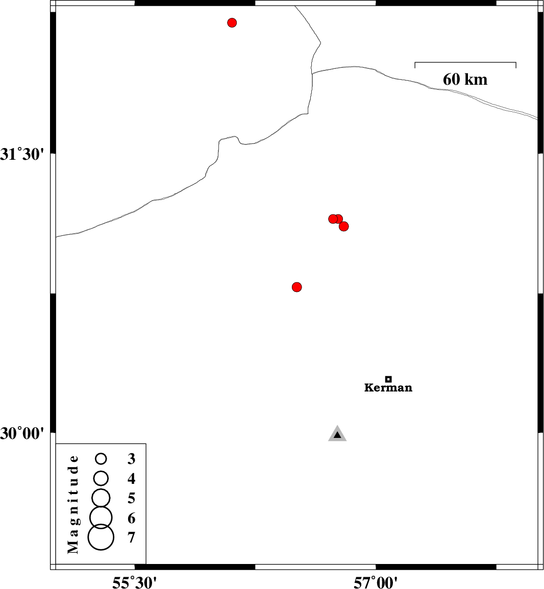 | 2017/03/04 | 19:36:56.2 | 23:06:56.2 | 31.149 | 56.765 | 14 | ML:2.5 | Kerman Province, 14 km South of Ravar | ||