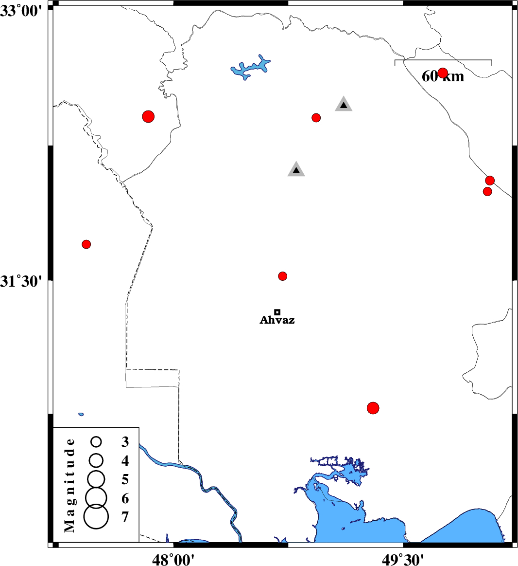 | 2017/03/27 | 01:56:53.6 | 06:26:53.6 | 31.523 | 48.713 | 15 | ML:2.5 | Khoozestan Province, 23 km North of Ahvaz | ||