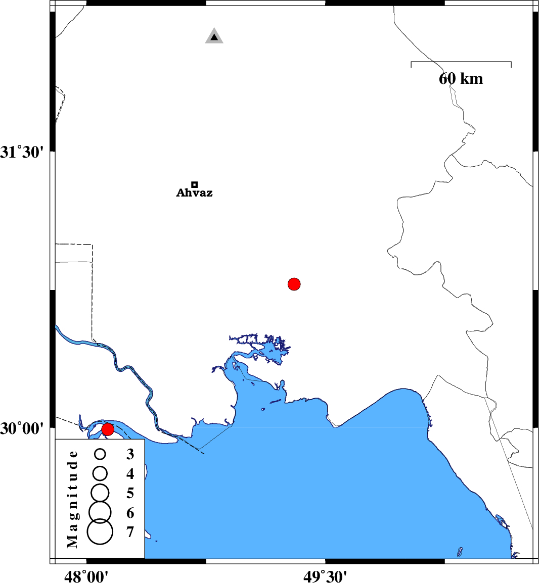 | 2017/03/19 | 22:36:36.0 | 02:06:36.0 | 29.991 | 48.133 | 15 | ML:3.5 | Persian Gulf, 49 km South of Khorramshahr |
