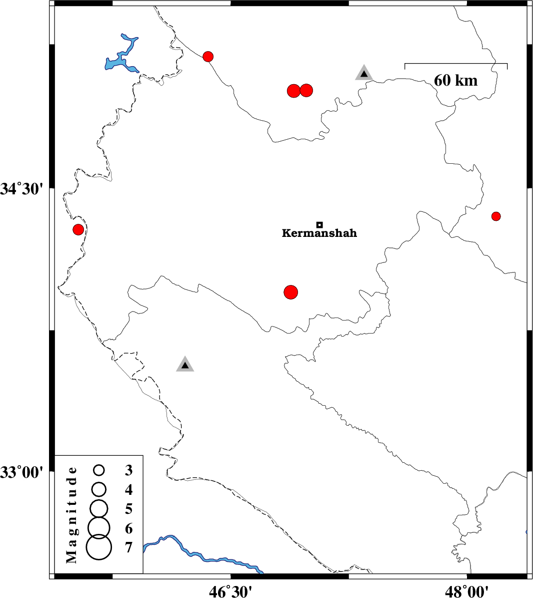 | 2017/03/24 | 13:39:54.3 | 18:09:54.3 | 33.951 | 46.881 | 14 | ML:3.9 | Kermanshah Province, 32 km South-East of Eslam Abad-E-Gharb | ||
