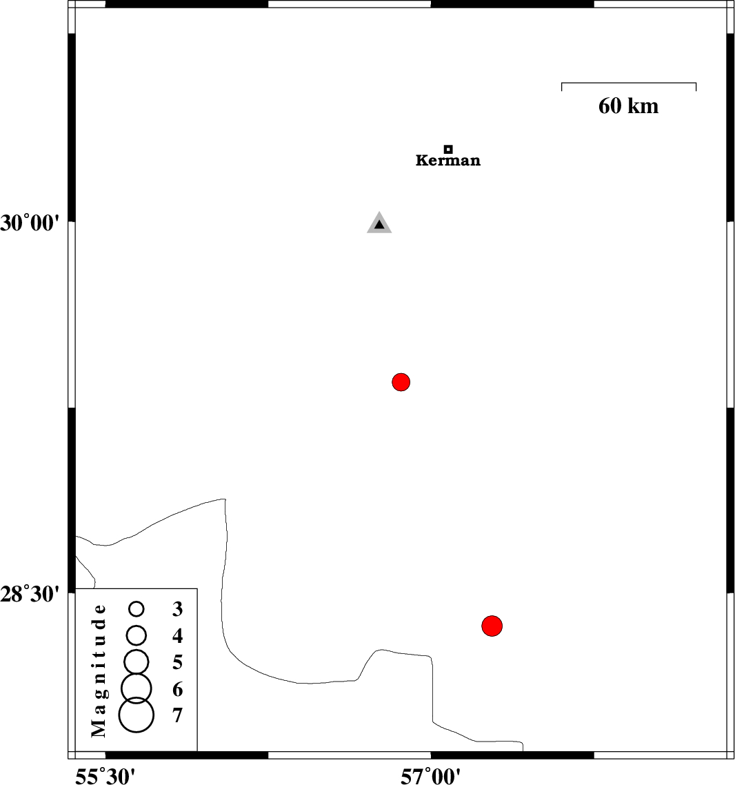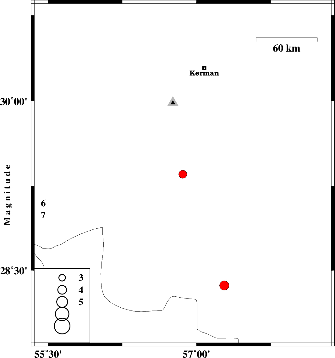 | 2017/03/25 | 07:38:38.1 | 12:08:38.1 | 28.366 | 57.28 | 15 | ML:4.2 | Kerman Province, 56 km South-West of Jiroft |