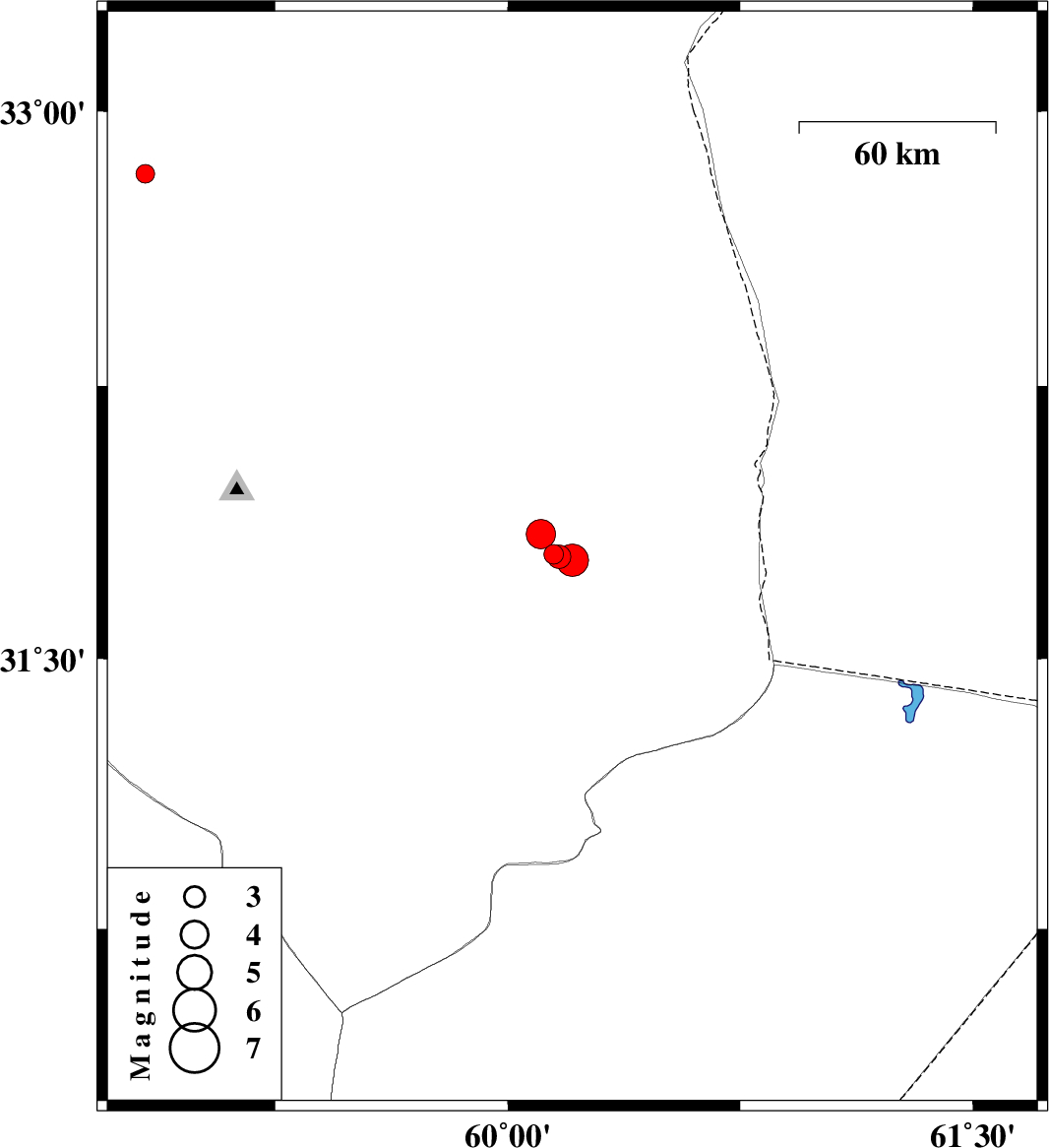 | 2017/04/04 | 15:49:25.2 | 20:19:25.2 | 31.788 | 60.148 | 14 | ML:2.8 | Khorasan(south) Province, 30 km North-East of Nehbandan | ||