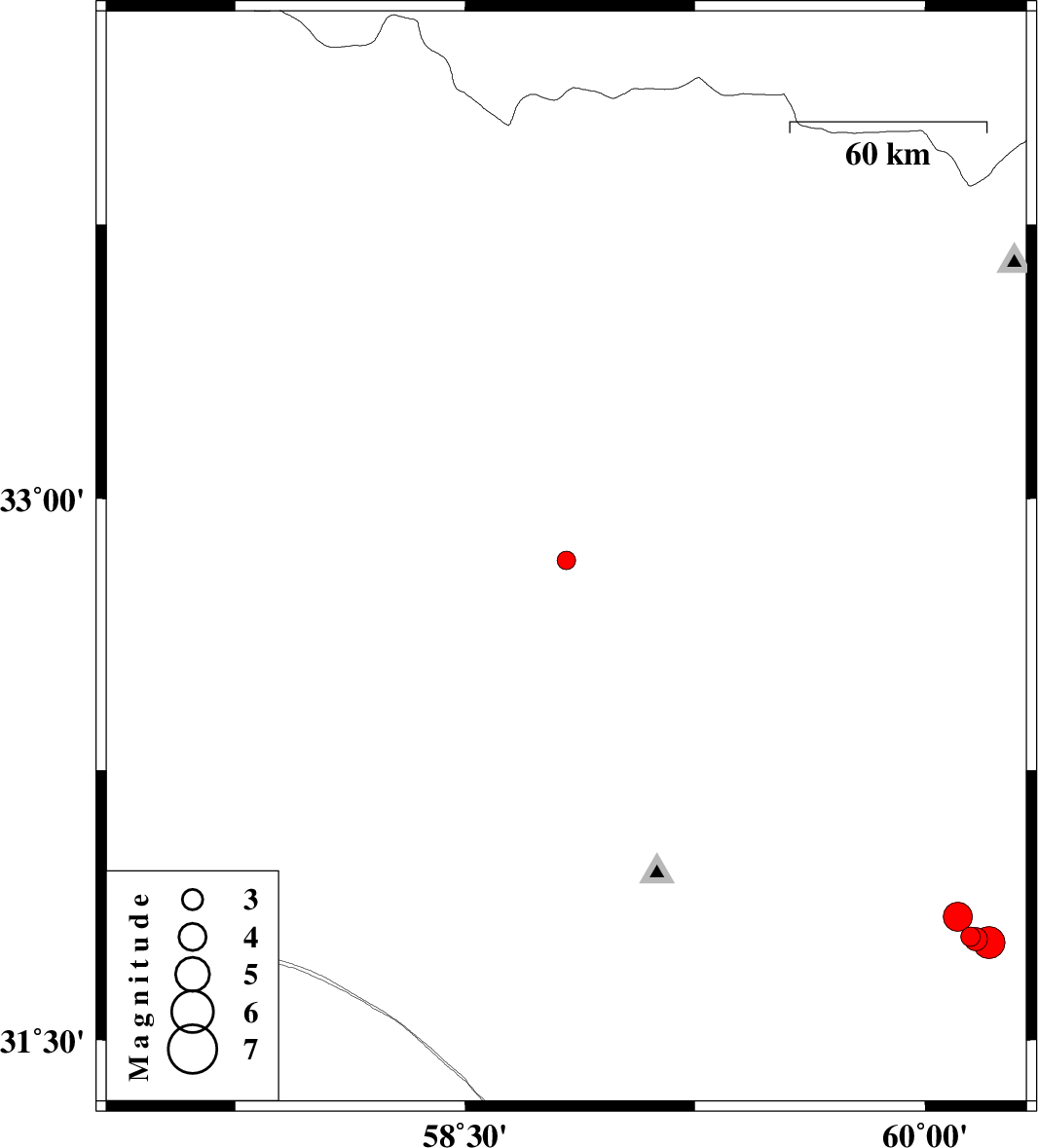 | 2017/04/04 | 15:49:25.2 | 20:19:25.2 | 31.788 | 60.148 | 14 | ML:2.8 | Khorasan(south) Province, 30 km North-East of Nehbandan | ||