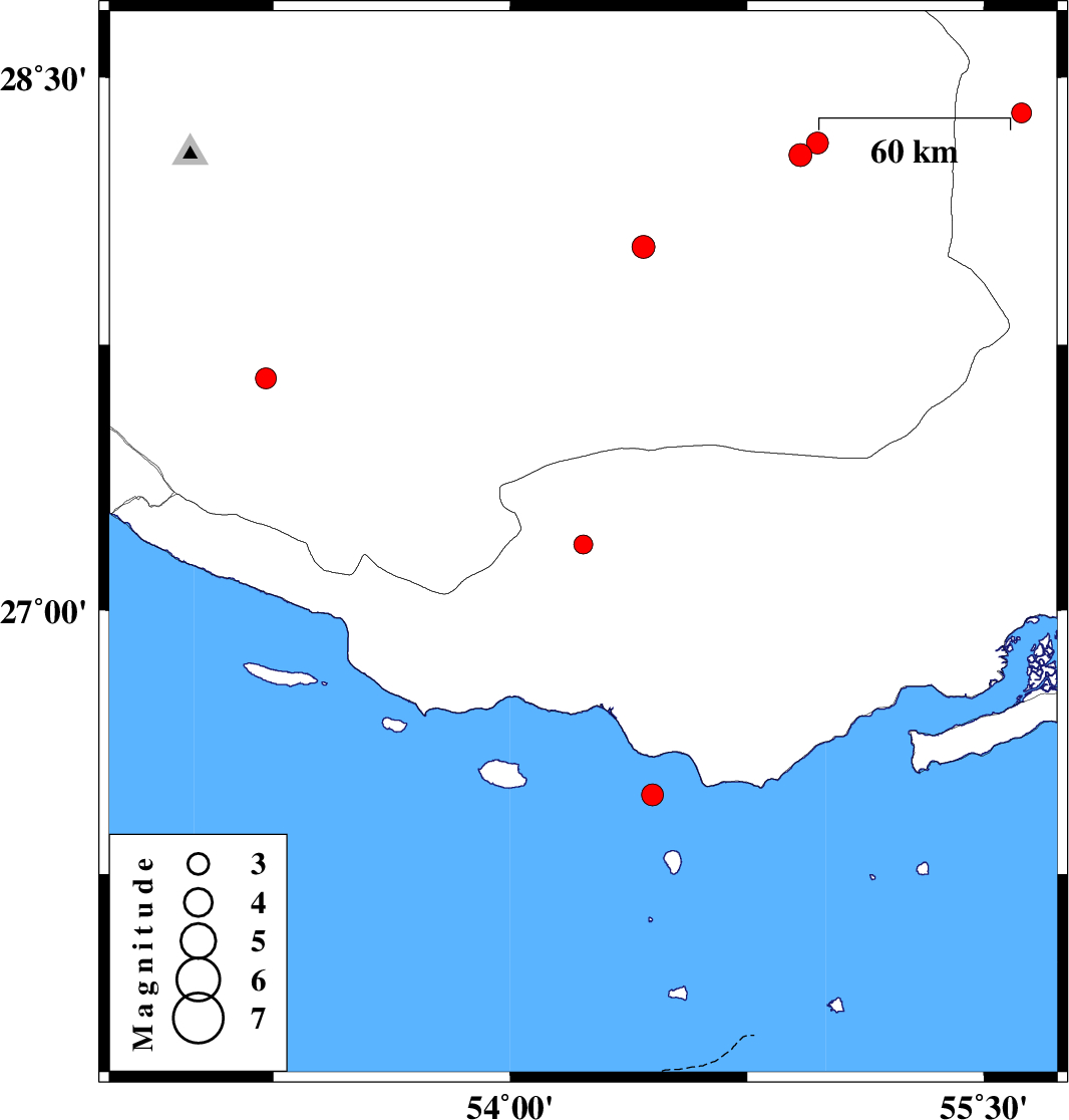 | 2017/03/21 | 07:30:49.1 | 11:00:49.1 | 28.317 | 54.972 | 14 | ML:3.1 | Fars Province, 64 km South-East of Darab | ||