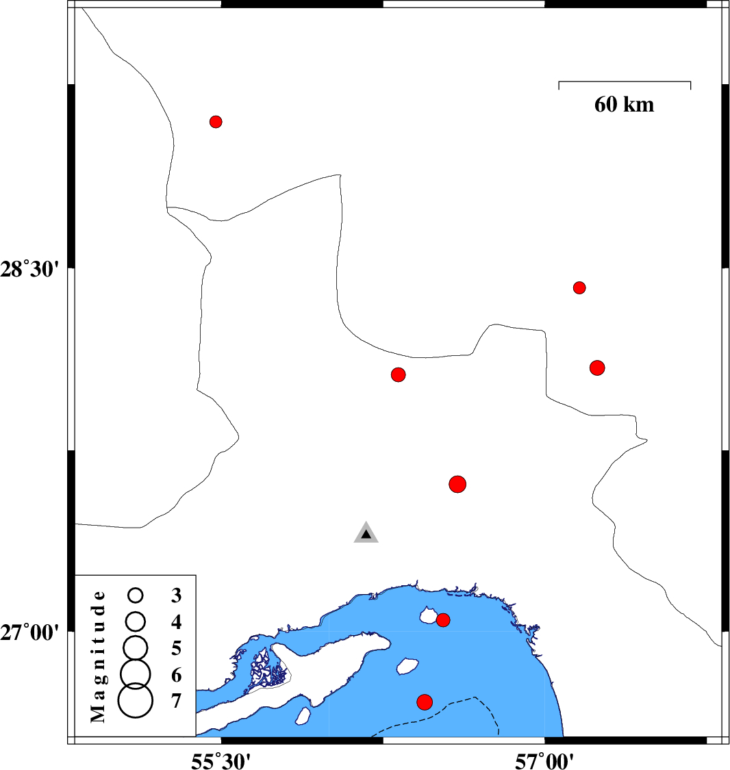 | 2017/04/18 | 01:20:04.7 | 05:50:04.7 | 27.047 | 56.528 | 11 | ML:2.8 | Persian Gulf, 28 km -East of Qeshm | ||